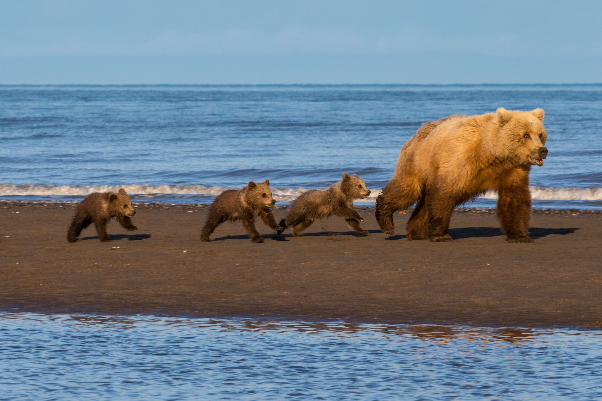 Muttertier flüchtet mit den 3 Jungen vor dem fremden Bären